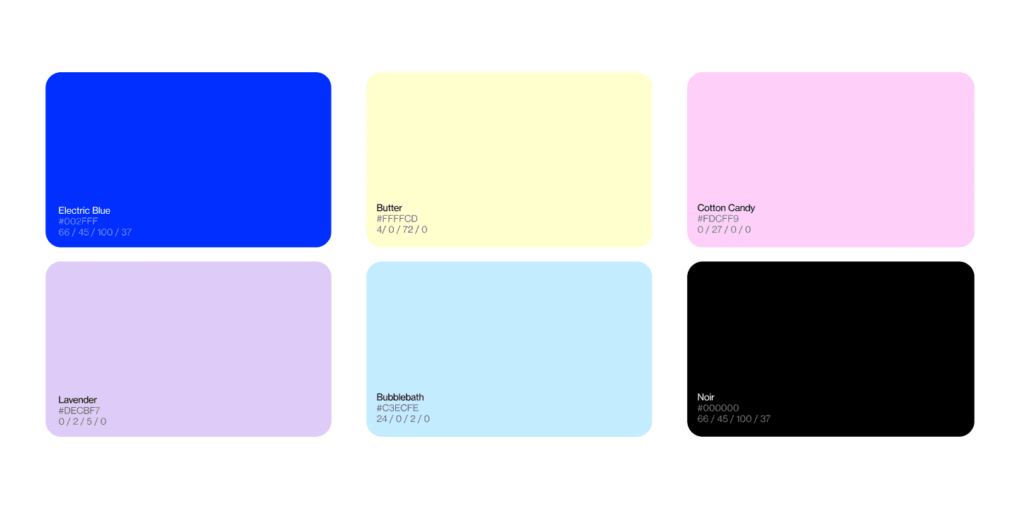 This playful, vibrant palette isn't what you'd expect from a med spa—and that's the whole point. Electric Blue, Butter, Cotton Candy, Lavender, Bubblebath, and Noir break the mold of sterile and cold. Instead, the brand feels modern, confident, and genuinely approachable. Premium treatments don't need to feel intimidating.